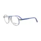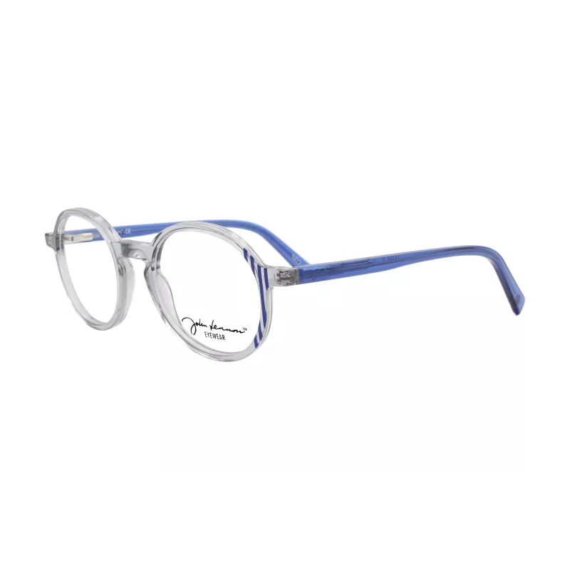 Monture de lunettes de vue John Lennon ronde, transparente avec des détails à rayures bleues et des branches bleues.