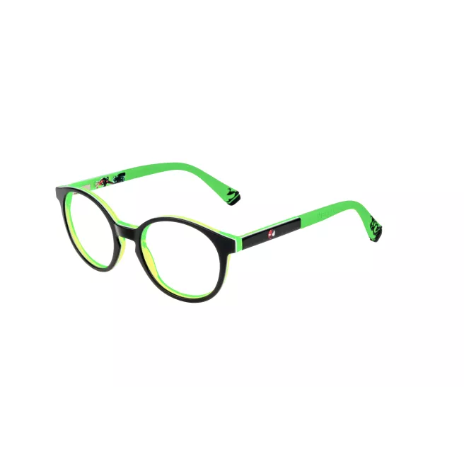 Monture de lunettes de vue Spider-Man noire et vert fluo avec la tête de Spider-Man sur les branches pour les enfants.