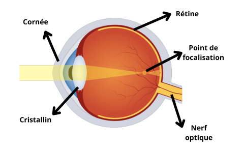 L’hypermétropie est caractérisée par un défaut de l’œil. Le point focal se trouve derrière la rétine et l’œil doit donc accommoder sans arrêt pour faire avancer le point focal sur la rétine. Le cristallin peut être aplati, ou la cornée trop bombée, ce qui cause la vision hypermétrope. La vision se retrouve bonne de loin, mais floue de près. C’est donc l’inverse de la myopie.